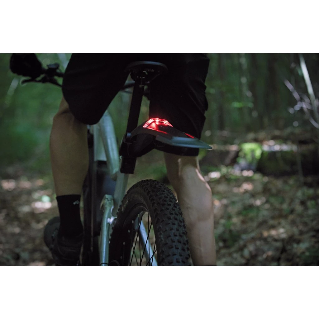 spatborden kunnen gemakkelijk en veilig worden bevestigd. Magnetische beugels maken de montage kinderspel. Bijzonder praktisch: de geïntegreerde verlichting in de achterwielbeschermer neemt de functie van het achterlicht over, dat bij e-mountainbikes dankzij de Monkey Link door de accu van stroom wordt voorzien.